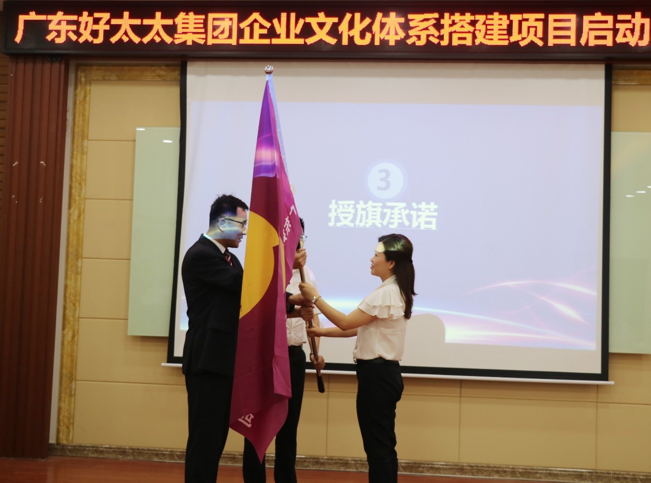 伴隨著莊嚴神圣的音樂,人力資源中心陳總和中大咨詢的蔡總從王總手中接過司旗,并鄭重許下承諾。在場的全體領導也在承諾書上簽下自己的名字。授旗、承諾這不僅是一面旗子、一張承諾書,背后意味著承擔的使命和責任。