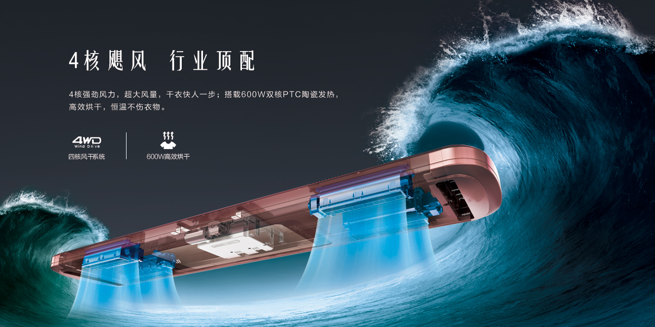 至尊性能:創行業巔峰,超強4核颶風,超大風量,搭載600W雙核PTC陶瓷發熱,高效烘干。