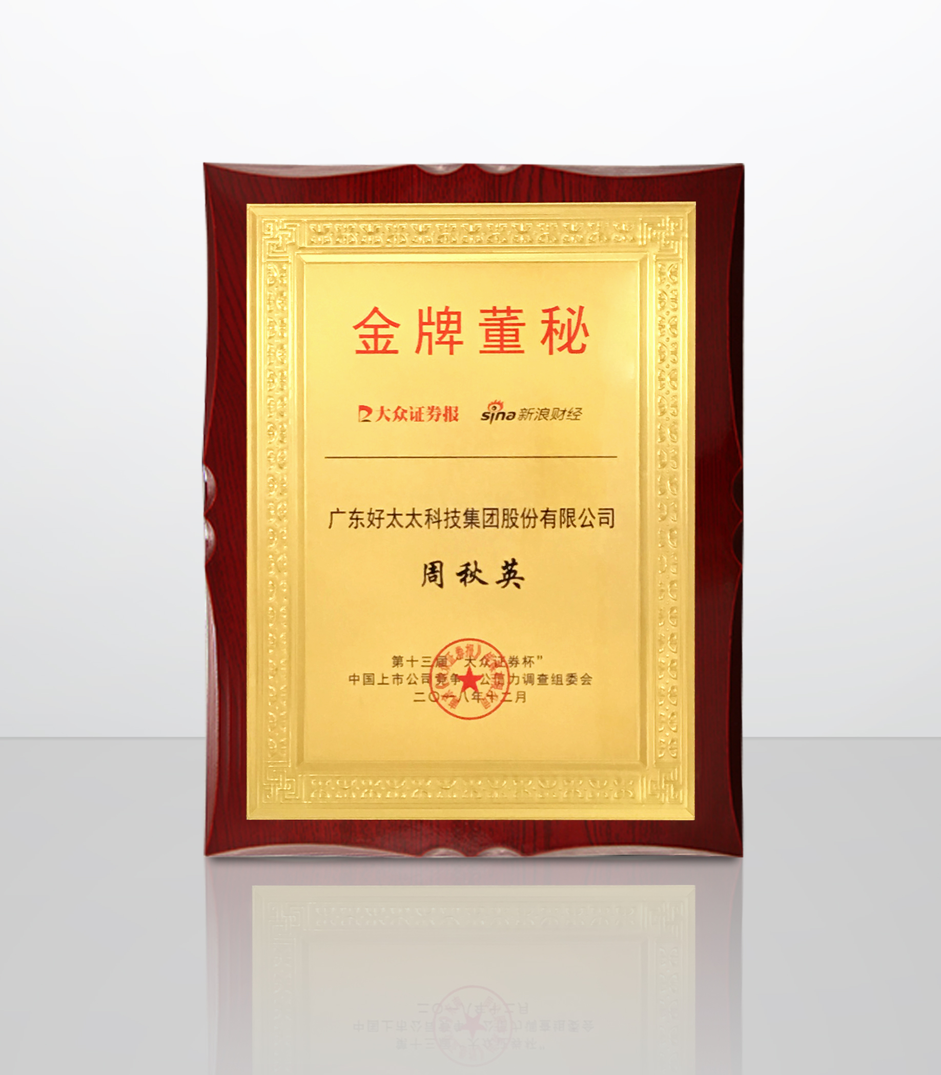 由《大眾證券報》主辦,新浪財經協辦的“2018中國A股上市公司創新指數排行榜發布暨第十三屆中國上市公司競爭力公信力調查評選頒獎高峰論壇”在南京隆重舉行。本次峰會以“鼎新賦能”為主題,匯聚中國數百家優秀上市公司及投資機構,邀請學界專家、政府官員齊聚南京,從全球視野、專家視角共話財經宏圖與創新愿景。峰會上好太太集團(603848)榮獲“最佳資本新銳獎”,集團董秘周秋英女士榮獲“金牌董秘”稱號。