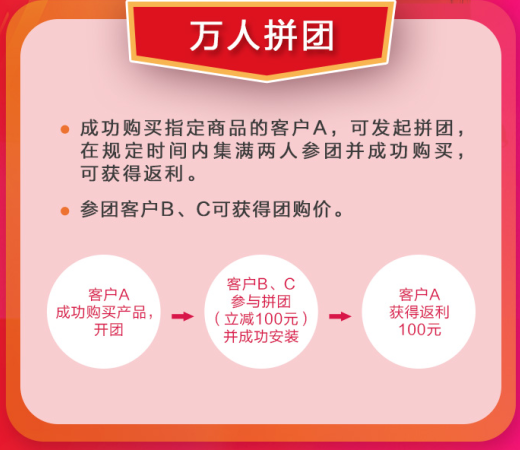 1、用戶A在線購買成功后,可發起拼團,規定時間內集滿兩人參團并成功購買,可獲得返利。