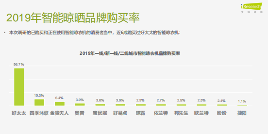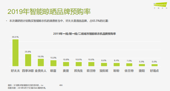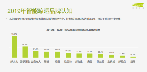 白皮書數(shù)據(jù)公開可知,好太太的品牌認(rèn)知度更是達(dá)到78.6%,且調(diào)研的已購買和正在使用智能晾衣機(jī)的消費(fèi)者當(dāng)中,近6成購買過好太太的智能晾衣機(jī)消費(fèi)者。不論是品牌認(rèn)知度、購買率和預(yù)購率等都是以大比例拉開第二名。尤其在產(chǎn)品購買率上,好太太領(lǐng)先第二名46.4%,數(shù)據(jù)背后體現(xiàn)的是,所有品牌晾曬市場都不及好太太一家的體量大,好太太在業(yè)內(nèi)不僅是“大牌子”,而是“超級大牌”。