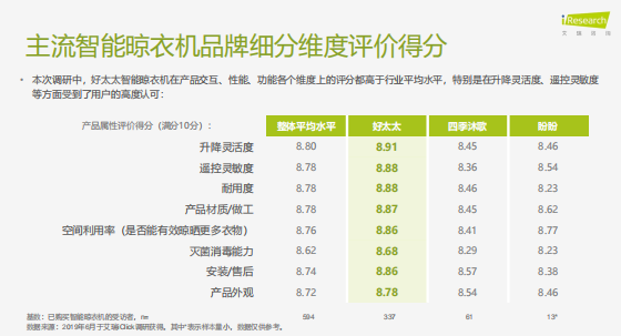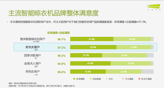購買智能晾衣機(jī)消費(fèi)者,對好太太智能晾衣機(jī)所使用產(chǎn)品的滿意度最高達(dá)到97.3%,且從晾衣機(jī)升降靈活度、遙控靈敏度、耐用度、滅菌消毒能力等多個維度上看,都是高于整體平均水平。