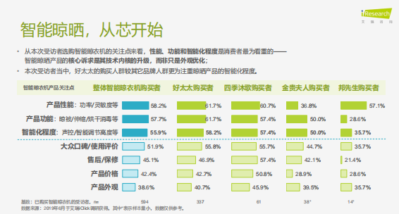 從本次受訪者選購智能晾衣機(jī)的關(guān)注點(diǎn)來看,性能、功能和智能化程度是消費(fèi)者最為看重的,智能晾曬產(chǎn)品的核心訴求是其技術(shù)內(nèi)核的升級,而非只是外觀優(yōu)化。