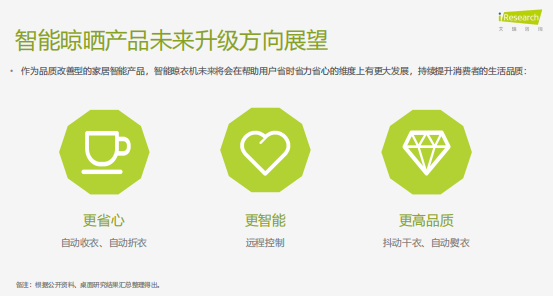 作為品質(zhì)改善型的家居智能產(chǎn)品,智能晾衣機(jī)未來將會在幫助用戶省時省力省心等三個維度上有更大發(fā)展,持續(xù)提升消費(fèi)者的生活品質(zhì)。