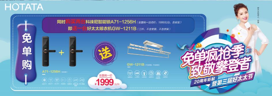 *免單購:同時購買兩臺科徠尼智能鎖A71-1256H(全國統一活動價:1999元/臺,含安裝),即送一臺好太太晾衣機GW-1211B(三桿,不含安裝,不含衣架)
