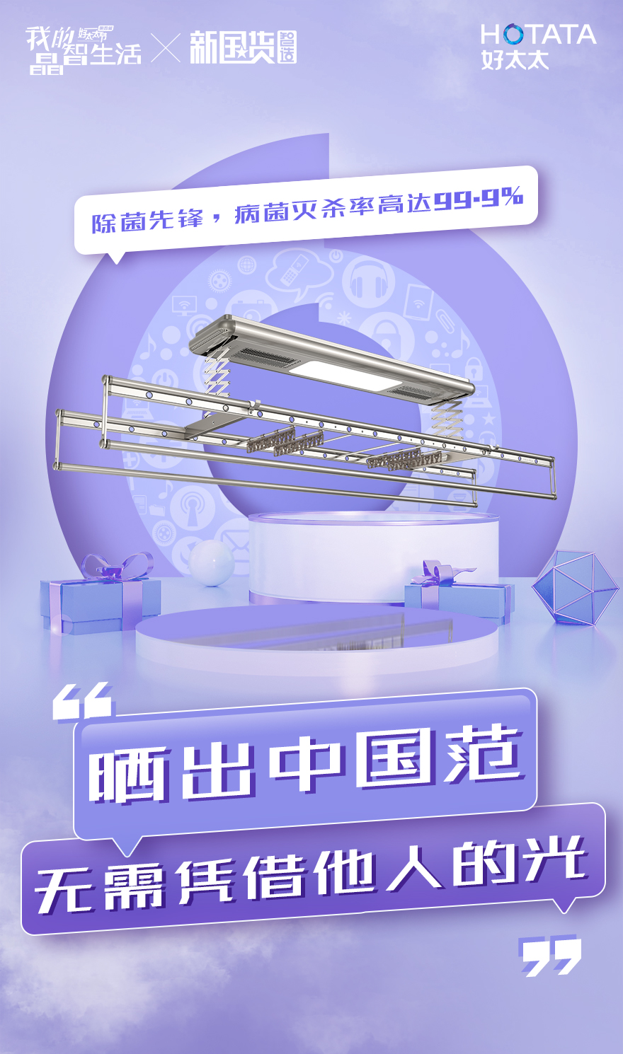 好太太1266智能晾衣機(jī),施華洛世奇®元素點(diǎn)綴其中,打造晾衣機(jī)的“門面擔(dān)當(dāng)”,顏值抗打之余,內(nèi)涵十足,自帶大燈,消毒、風(fēng)干、APP控制皆不在話下,營造晶智家。