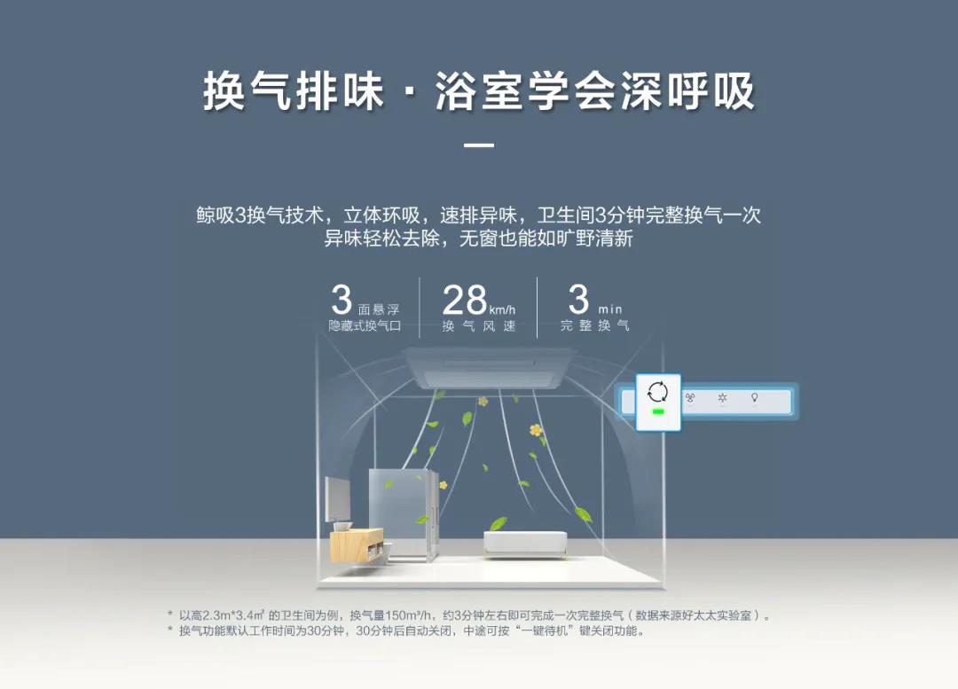 浴室有異味怎么辦?打開換氣排味功能,3面懸浮隱藏式換氣口,每小時28公里換氣風速,3分鐘就能完整換氣一次,浴室從此學會深呼吸!