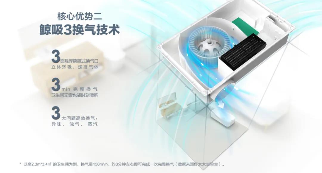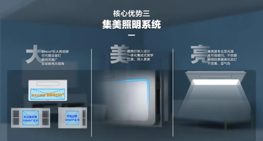 巨靈神三防電機,防水防潮防腐蝕;鯨吸3換氣技術,衛生間無窗也能時刻清新;還有集美照明系統,三大核心優勢,令大家又多了一個理由選擇好太太智能浴霸!