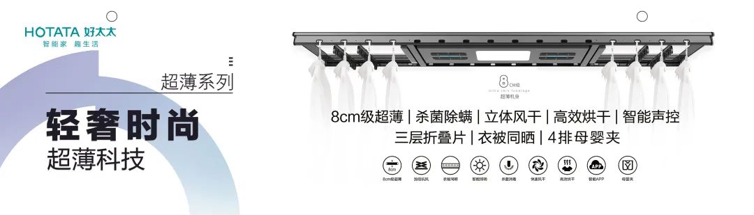 為滿足人們防疫需求,好太太智能晾衣機配備智能殺菌消毒功能,紫外線除菌消毒做到99%有效殺菌,守護衣物健康。