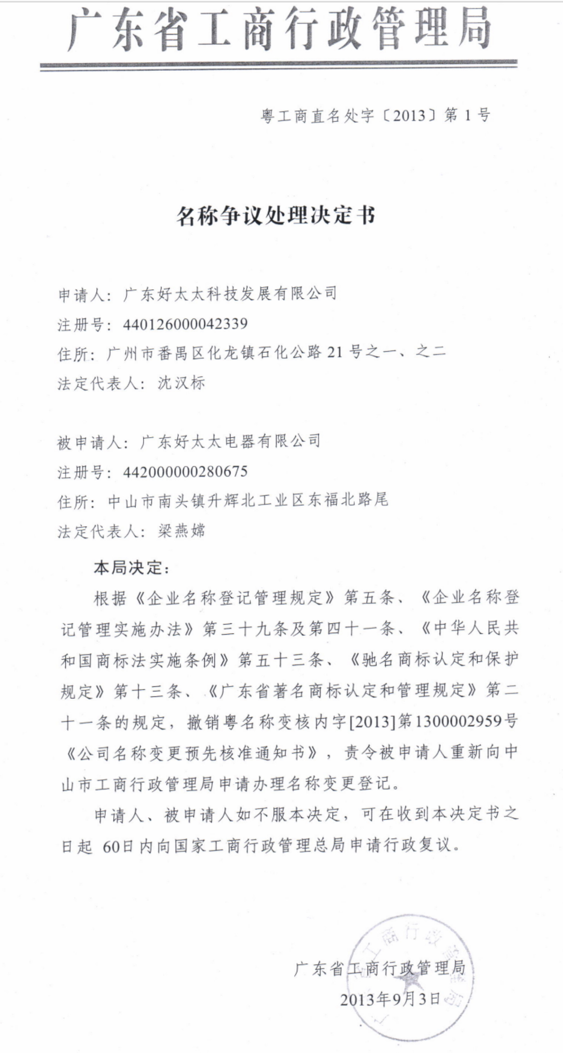 2009年11月20日,時(shí)稱中山市好太太電器有限公司的法定代表人老健明設(shè)立了中山市好生活電器有限公司,后于2013年1月30日更名為“中山市好太太電器有限公司”、于2013年2月27日更名為“廣東好太太電器有限公司”。因該企業(yè)名稱中再次使用“好太太”字號(hào)涉嫌不正當(dāng)競(jìng)爭(zhēng),被廣東好太太集團(tuán)向廣東省工商行政管理局投訴,于2013年9月3日被廣東省工商局責(zé)令變更企業(yè)名稱。