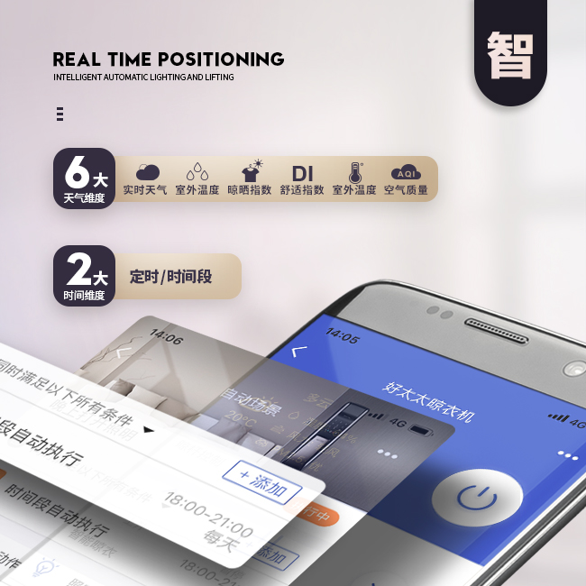 根據(jù)定位的實(shí)時(shí)環(huán)境信息,按照設(shè)定的時(shí)間或天氣條件,實(shí)現(xiàn)智能自動(dòng)開啟照明、升降。